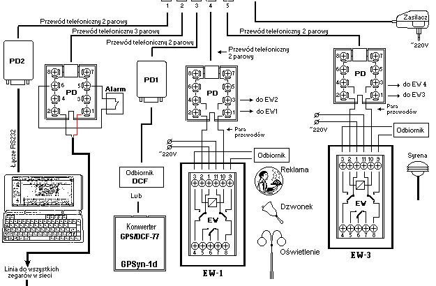 Elementy te konfiguruje się w zależności od ilości i rodzaju potrzebnych zegarów w sieci, wg zasad pokazanych na rysunku poniżej, przy czym zasilacze do każdego rodzaju zegara sprzedawane są w komplecie z nim i nie wymagają wykazywania ich w zamówieniu.